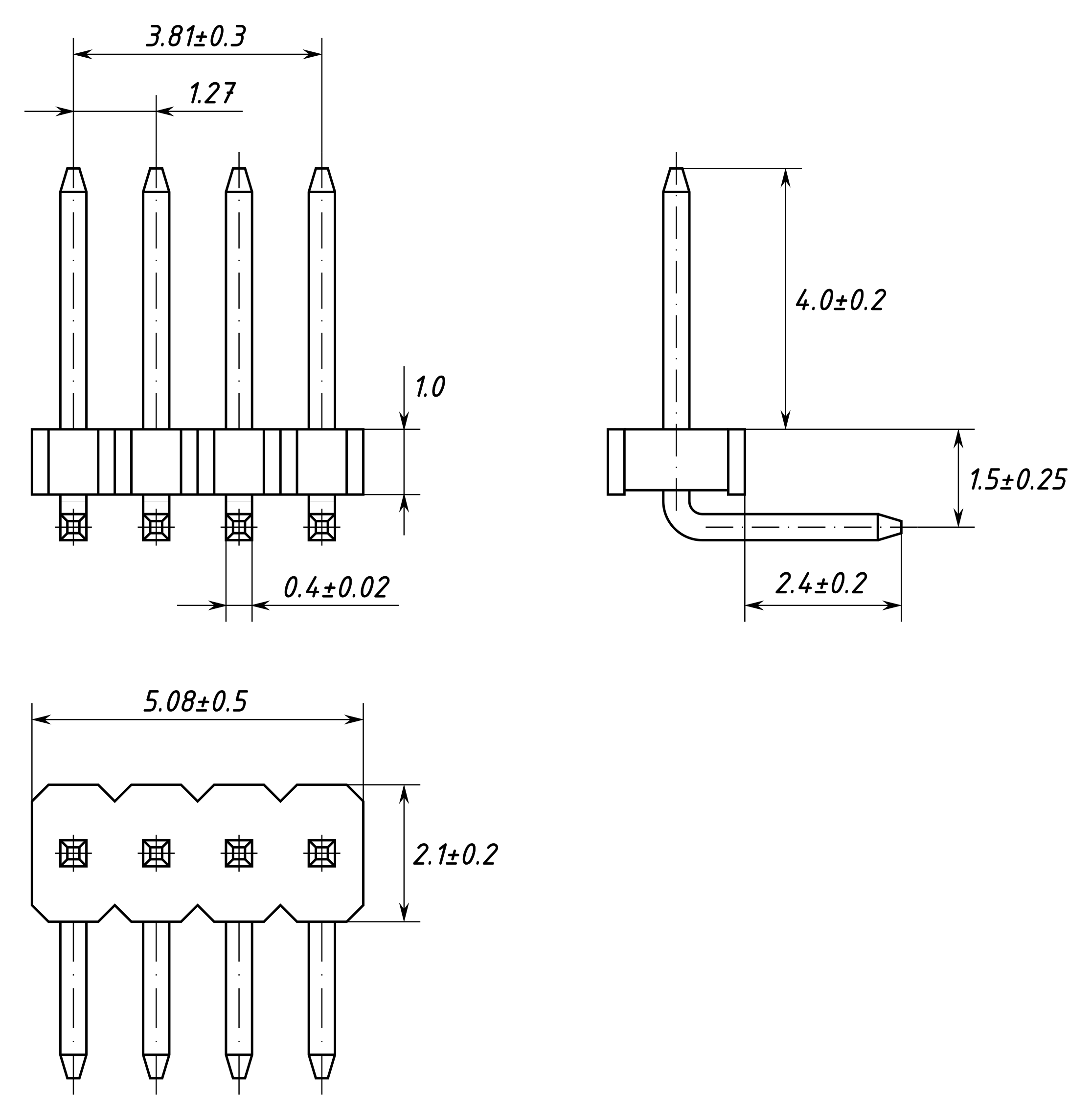 Однорядная штыревая вилка, 4 контакта с шагом 1.27мм