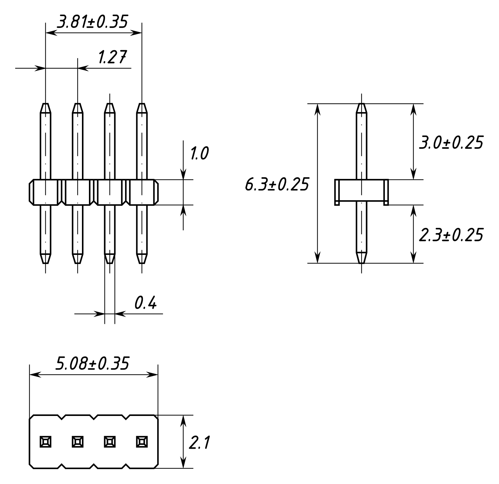 Однорядная штыревая вилка, 4 контакта с шагом 1.27мм
