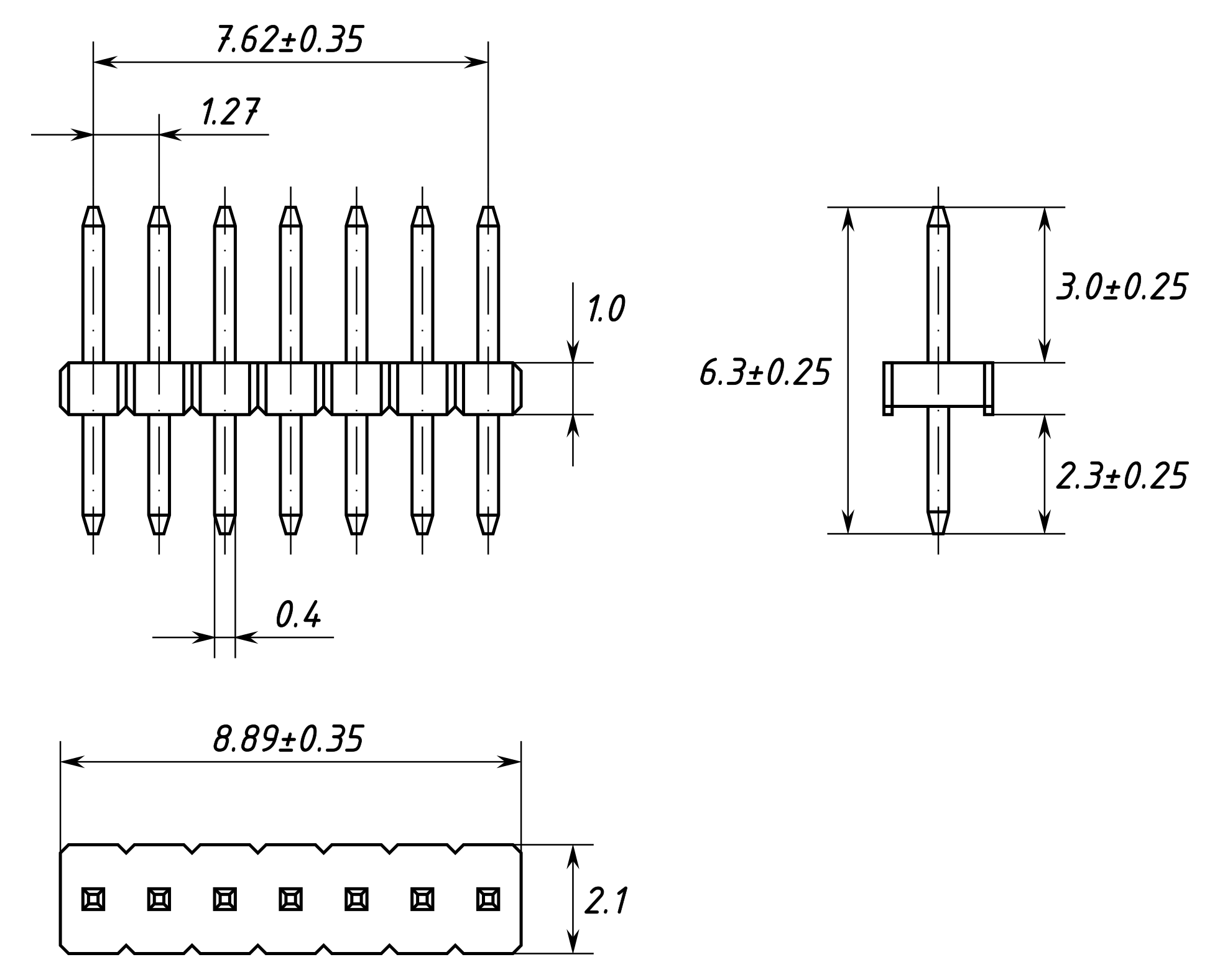 Однорядная штыревая вилка, 7 контактов с шагом 1.27мм