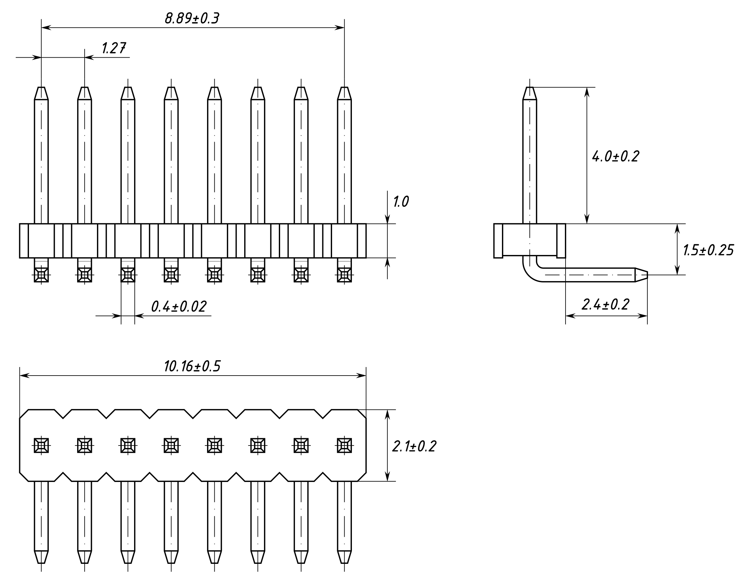 Однорядная штыревая вилка, 8 контактов с шагом 1.27мм