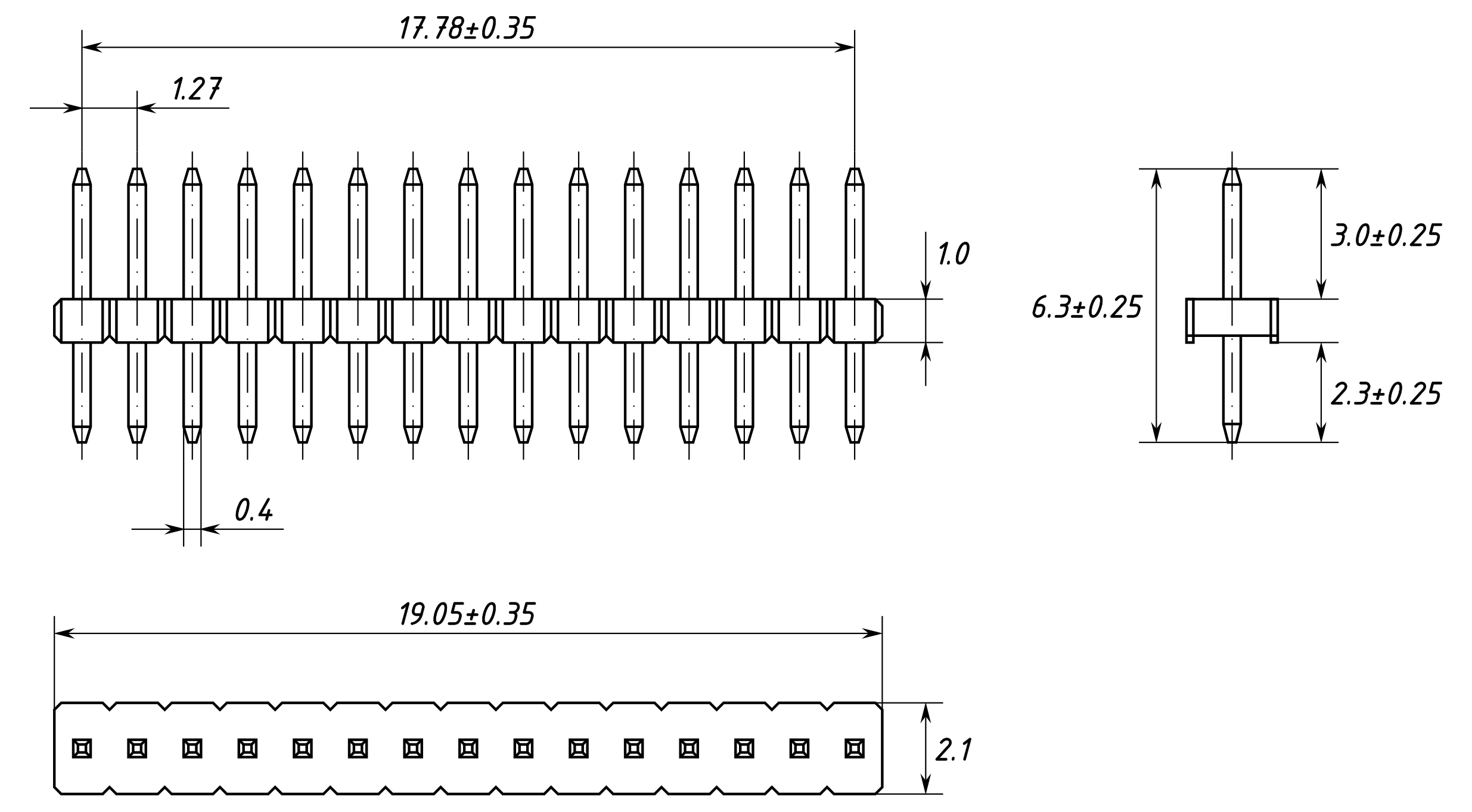 Однорядная штыревая вилка, 15 контактов с шагом 1.27мм