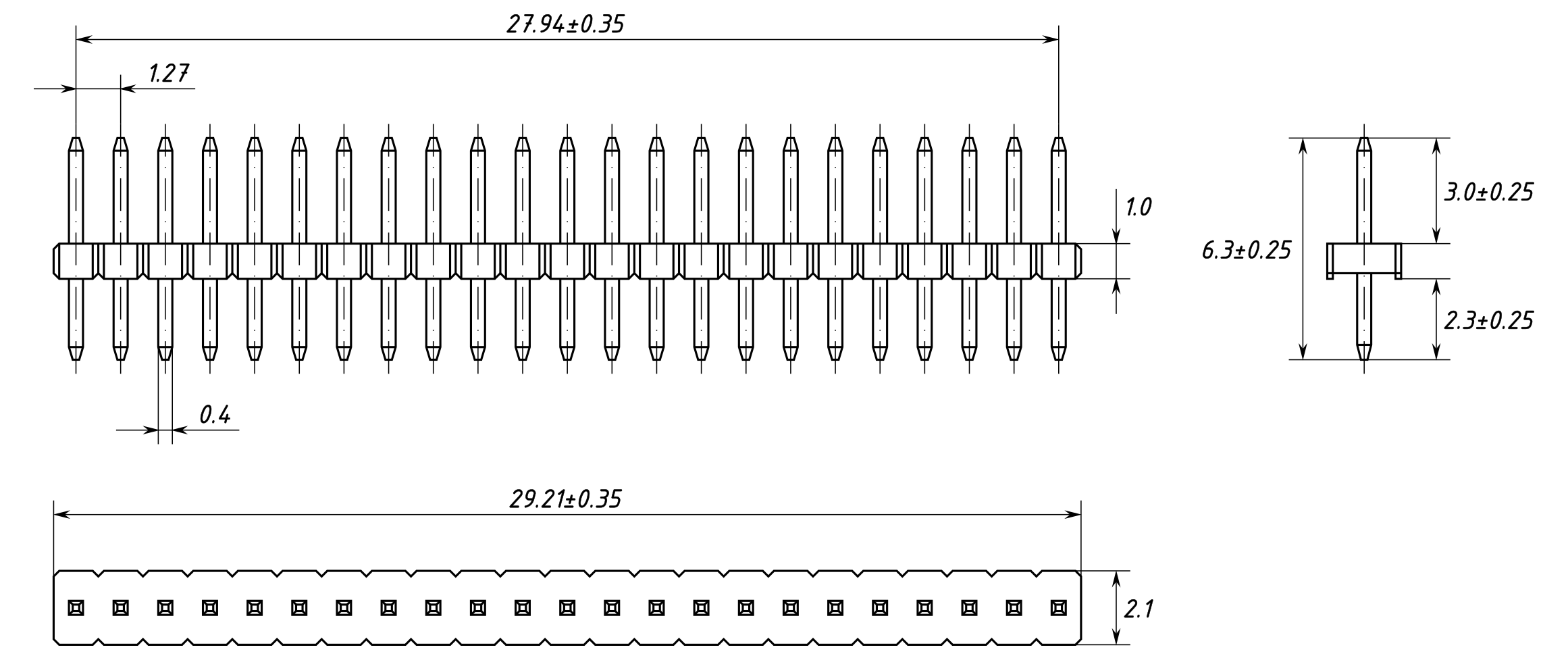 Однорядная штыревая вилка, 23 контакта с шагом 1.27мм