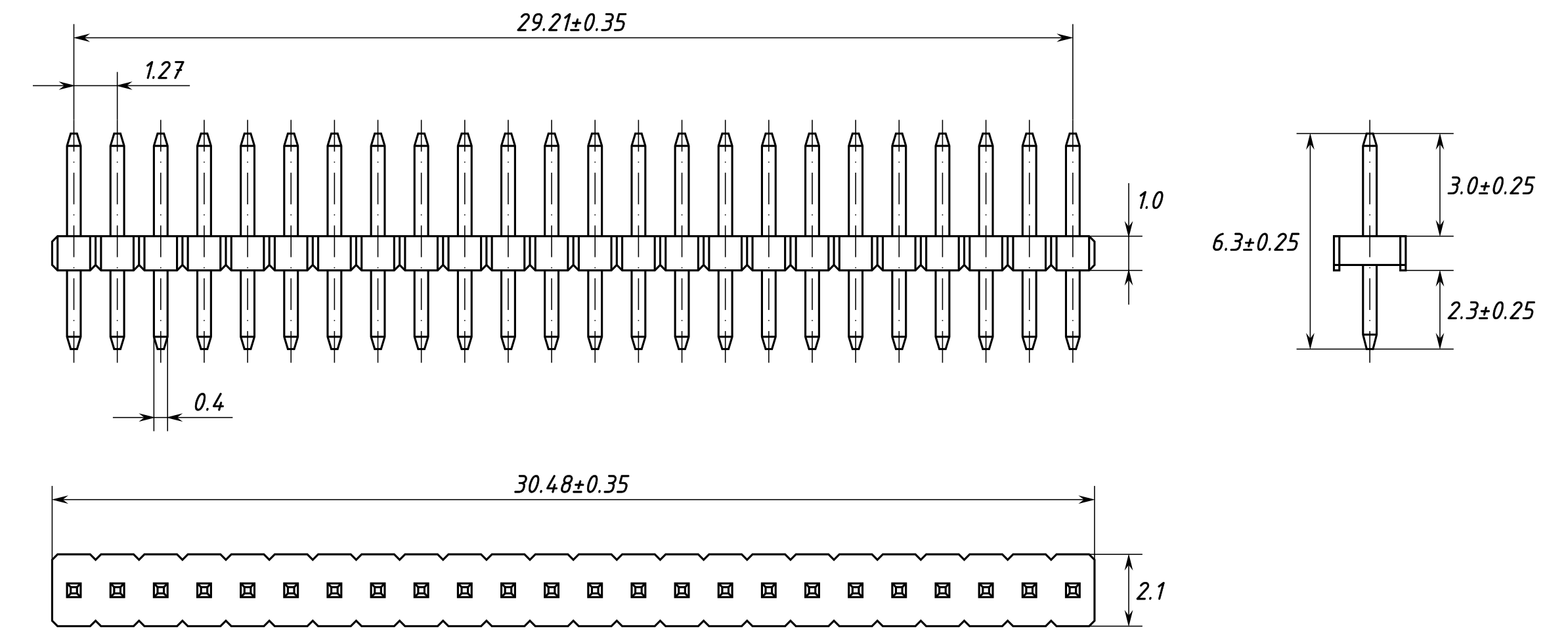 Однорядная штыревая вилка, 24 контакта с шагом 1.27мм