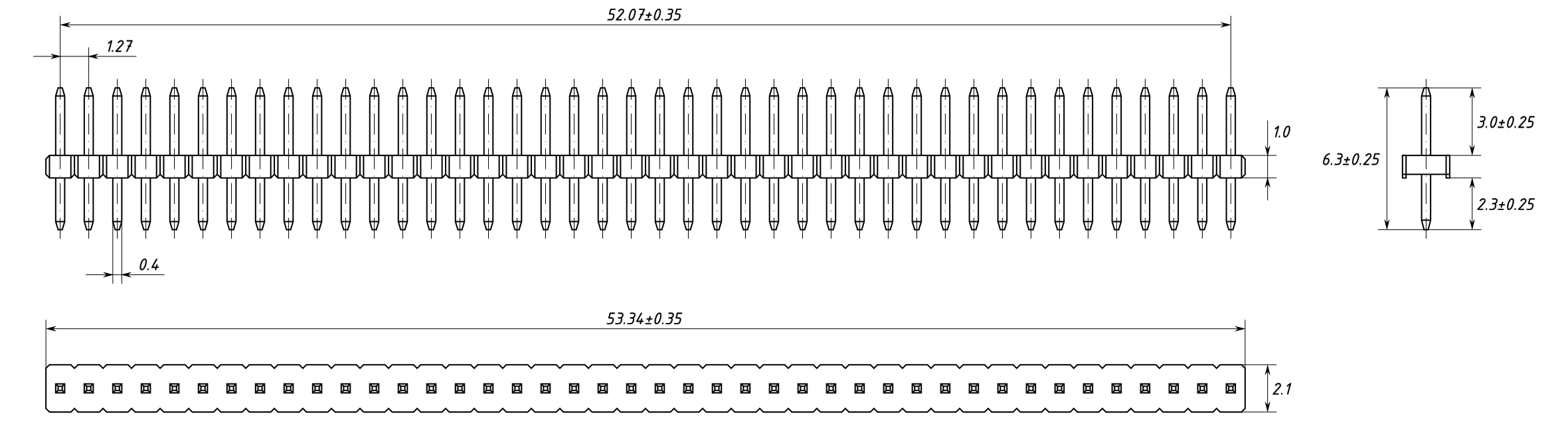 Однорядная штыревая вилка, 42 контакта с шагом 1.27мм